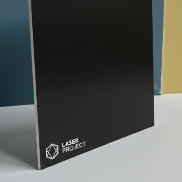 Plancha de acrílico bicapa de color negro/ grabado color blanco de 1.6 mm. de espesor para trabajos de rotulación, señalética, etiquetado, etc. disponible en varios formatos